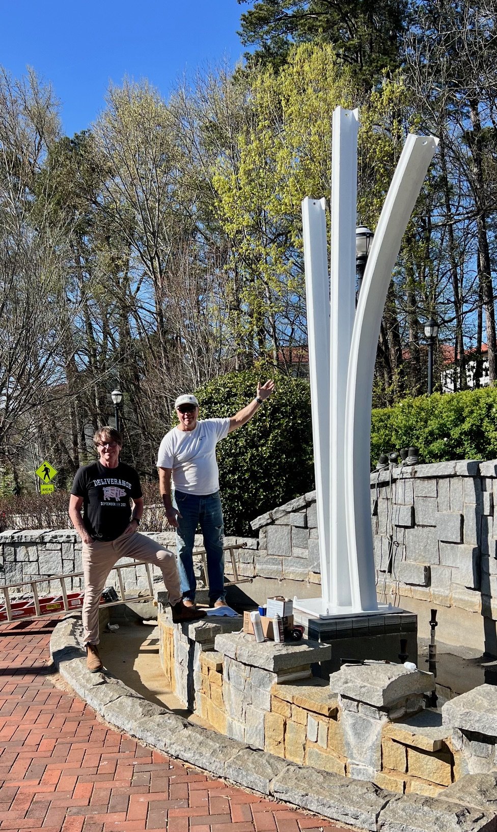 Calhoun salvaged several of the rails, measured them, and came up with a design for a sculpture that now sits in the center of the Emory Village Park’s new fountain. After Lithia Power Coating sandblasted and stripped off layers of thick flaking rust, Calhoun cut the three rails to sizes ranging from 13 feet to 15 feet and welded them to an inch thick steel plate. The rails are coated with a durable baked on white finish that ties in with the stone panels of the Emory gates, the park fountain, and the Emory Village sign — a juxtaposition of history and progress in the neighborhood and by Emory.